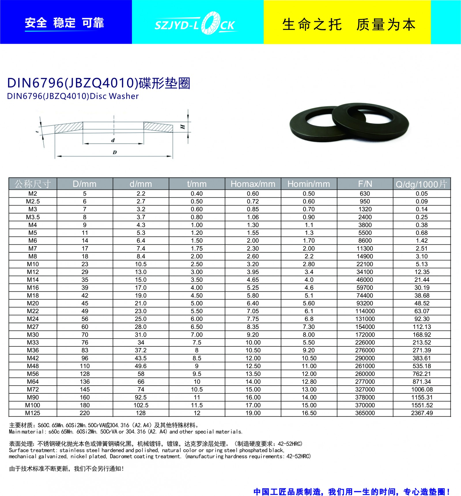 制造執行標準:符合DIN6796標準。規格:M2-M125型號,也可提供訂制服務主要材質有S60C,60Si2mn,51crav4及特殊合金材質,鹽浴硬化,表面處理為磷化黑,機械鋅,達克羅涂層等!不提供化學電鍍處理!多數情況下標準型碟形彈簧墊圈并不能完全滿足用戶要求,通過計算與適當調整來獲得理想的訂制功能!