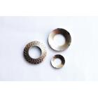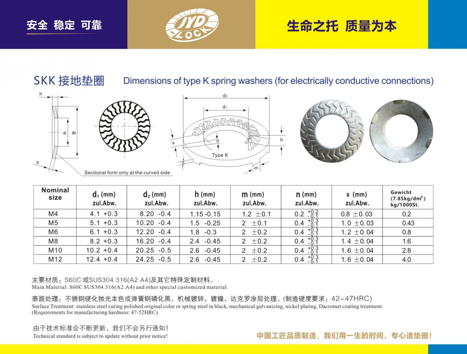 SKK標(biāo)準(zhǔn)接地墊圈、該墊圈是一款法式鎖緊墊圈的改良設(shè)計產(chǎn)品、表面條紋有預(yù)緊防松作用。墊圈的背面設(shè)計有六個爪形剌破角!主要功能是在配合螺栓螺釘擰緊時可以剌破金屬基體表面!主要功能是剌破作用、因此也有人叫剌破墊圈、帶爪觸地墊圈!